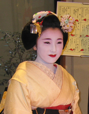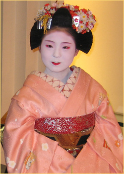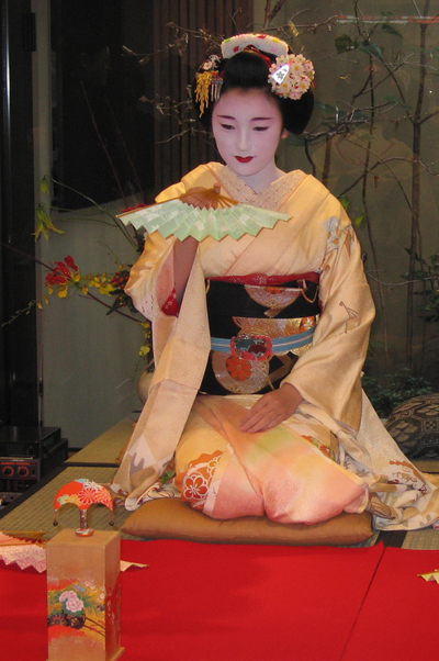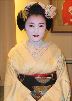 美しい着物をお召しになれらた舞妓さんが店内に到着されました。店内ではたくさんのお客様から「可愛いわ~」「きれいな舞妓さんね~」とあちらこちらから声が聞こえてまいります。