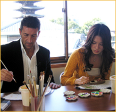 今回はとってもお洒落なジローラモさんと矢吹春奈さんが舞扇堂清水店にご来店下さいました。絵付け体験の取材でしたが和やかな雰囲気の中、撮影が始まり八坂の塔を背にお二人でゆったりと扇子に絵を描かれていました。とにかくジローラモさんはとっても日本語が上手で、矢吹春奈さんは超美しい女性でした。楽しい撮影もあっという間に終わり、最後は1階店舗でニッコリ笑って記念撮影です。楽しい撮影をありがとうございました!ジローラモさんのカンペはなんと日本語!?これにはみんなビックリ!でした。ぜひ、また京都へお越し下さいね♪