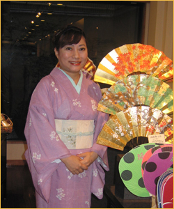 今回は女優の山村紅葉さんに舞扇堂祇園店へお越しいただきました。淡い紫の美しい着物をお召しになられた山村さんは本当に美しい。笑顔の絶えない方で、スタッフ方々への気配りなど、大女優さんとは思えないほど、優しい女性です。たくさんの撮影隊の皆さんと一緒に、和やかな雰囲気で撮影は進められました。最後に、1階店舗の中庭前でにっこり記念撮影です☆店舗にディスプレイしている扇子にも負けないくらい美しく貫禄のある方でした♪最後の最後まで楽しい雰囲気の中、撮影も終了です。撮影隊の皆さま、本当にありがとうございました!
